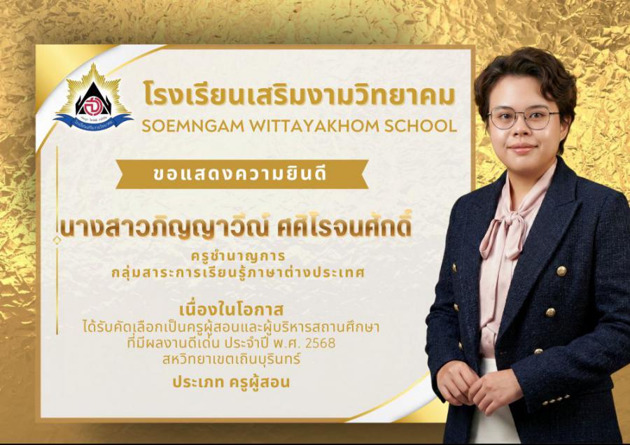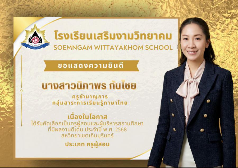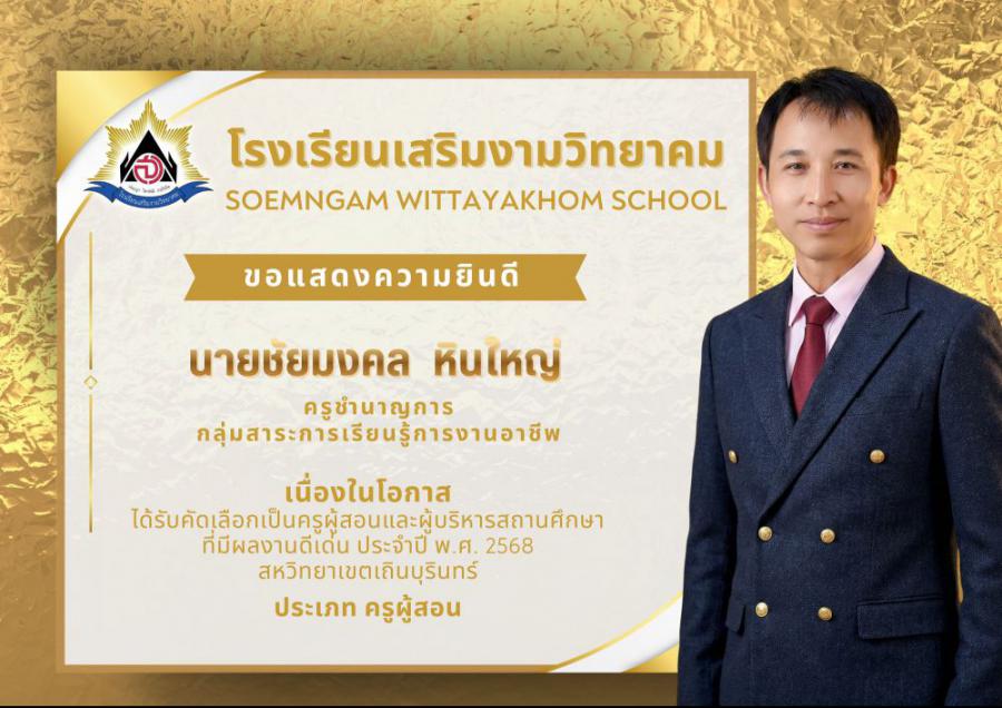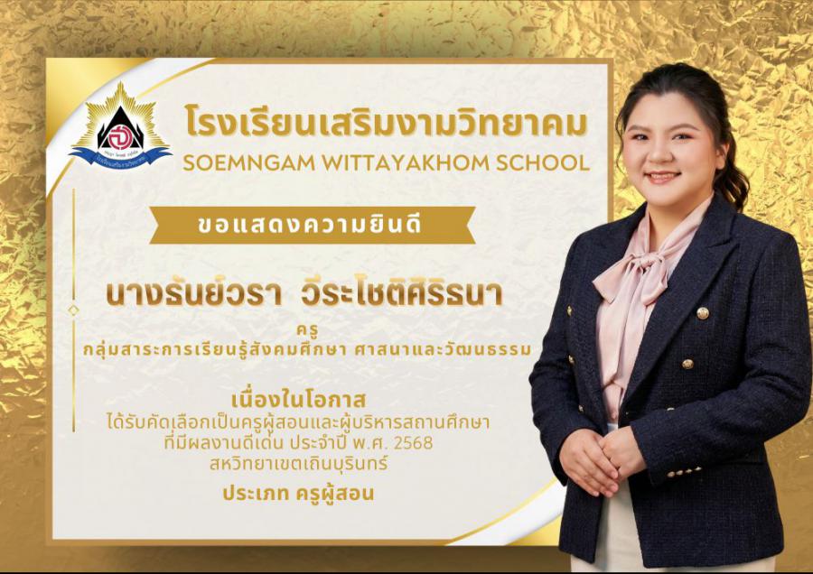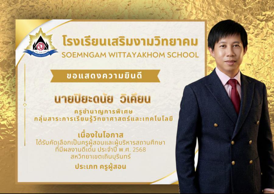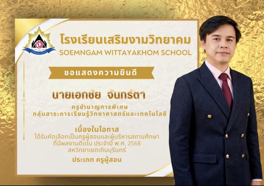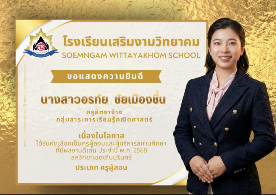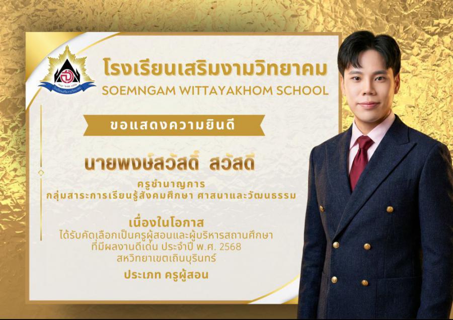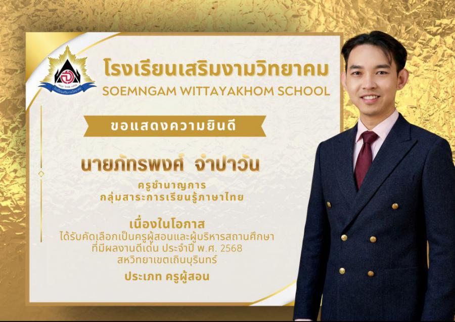 โรงเรียนเสริมงามวิทยาคม ขอแสดงความยินดีกับผู้บริหาร คณะครู และบุคลากรทางการศึกษาที่ได้รับคัดเลือกเป็นครูผู้สอนและผู้บริหารสถานศึกษาที่มีผลงานดีเด่น ประจำปี พ.ศ. 2569 สหวิทยาเขตเถินบุรินทร์ S:0
