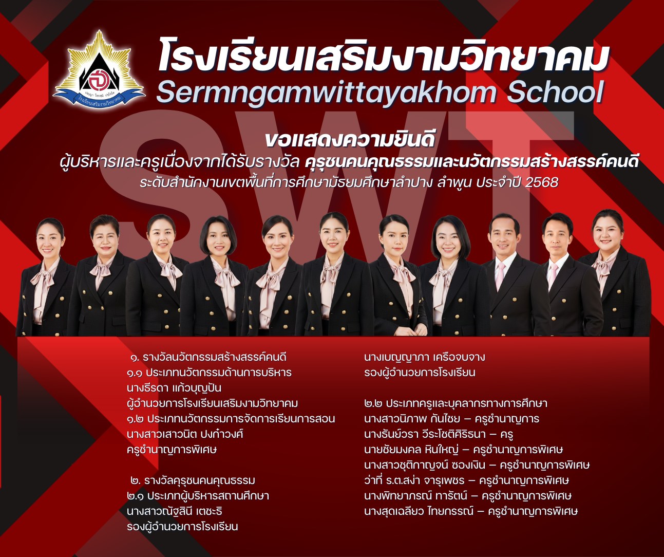 โรงเรียนเสริมงามวิทยาคม ขอแสดงความยินดีกับผู้บริหาร ครู และบุคลากรทางการศึกษา ที่ได้รับการคัดเลือกและได้รับรางวัล "คุรุชนคนคุณธรรม / นวัตกรรมสร้างสรรค์คนดี / โรงเรียนดีต้องมีที่ยืน"