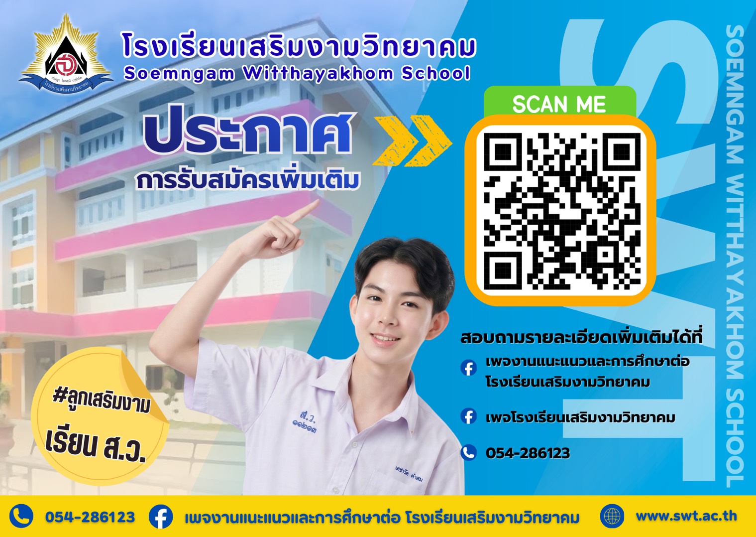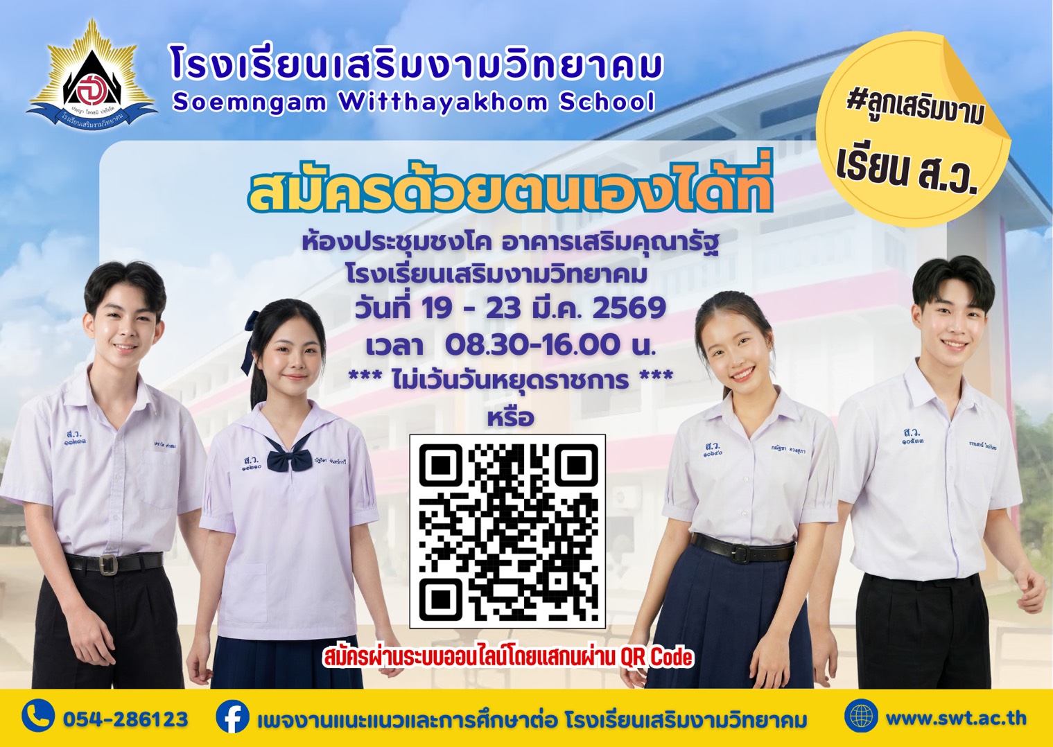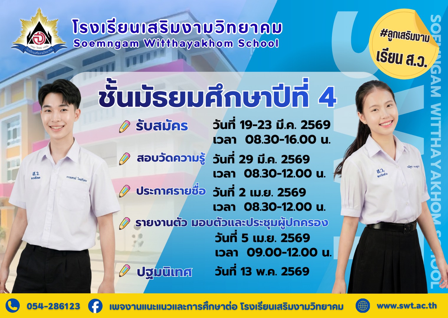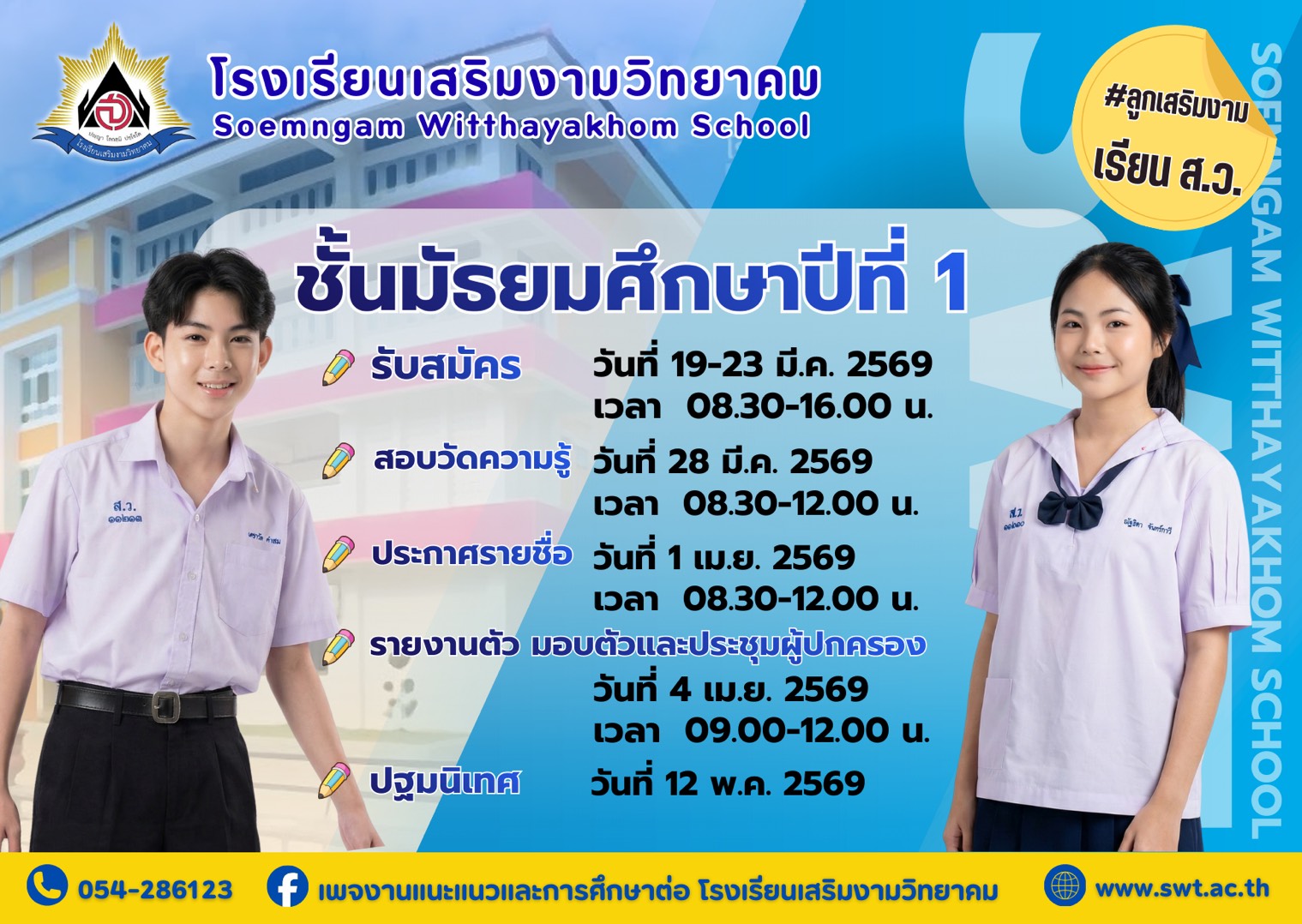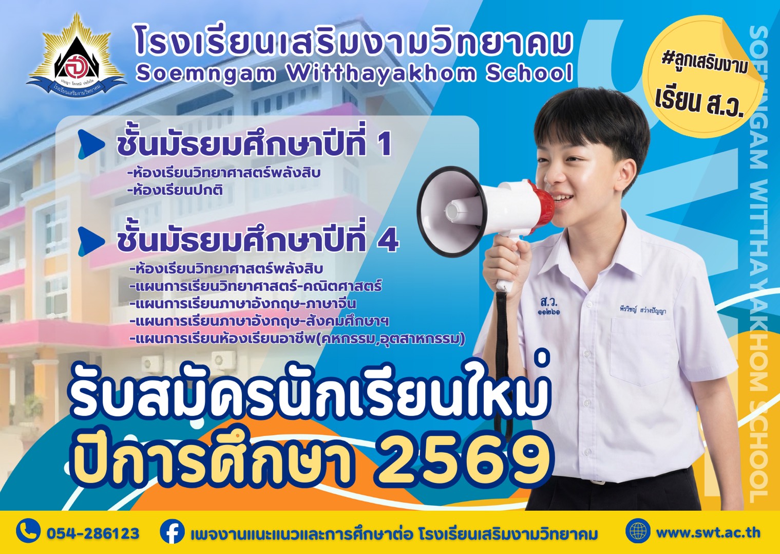 โรงเรียนเสริมงามวิทยาคม เปิดรับสมัครนักเรียนเข้าเรียนระดับชั้นมัธยมศึกษาปีที่ 1 และระดับชั้นมัธยมศึกษาปีที่ 4 ประจำปีการศึกษา 2569 ภายใต้นโยบาย “เปิดโอกาสทางการศึกษาอย่างเสมอภาค พัฒนาผู้เรียนรอบด้านทั้งวิชาการ ทักษะชีวิต และอาชีพ”