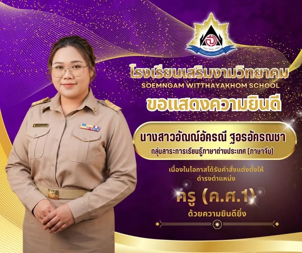 โรงเรียนเสริมงามวิทยาคม ขอแสดงความยินดีกับ นางสาวอัณณ์อัครณี ฐอรอัครณชา ครูกลุ่มสาระการเรียนรู้ภาษาต่างประเทศ (ภาษาจีน) เนื่องในโอกาสที่ได้รับการเลื่อนตำแหน่ง ครู